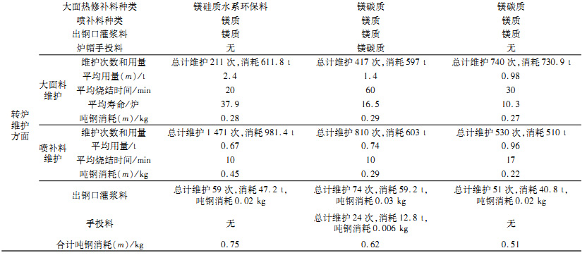 1)Z1所在鋼廠只有2座轉爐,選擇鎂硅質環保熱修補料以滿足其轉爐出鋼頻率高和維護時間短的工況條件,Z2和Z3所在鋼廠都有3座轉爐,采用鎂碳質熱修補料能適應當前的出鋼頻率和維護模式。從整個爐役來看,鎂硅質環保熱修補料的噸鋼消耗與鎂碳質熱修補料的消耗是接近的,但鎂硅質料燒結時間短、使用壽命長,可大大提高轉爐的周轉效率。比較Z1、Z2和Z3,Z1總計維護211次耗時4220min,而Z2總計維護417次耗時25020min,Z3總計維護740次耗時22000min。按1爐鋼水冶煉周轉時間40min計算,如果Z2和Z3采用鎂硅質料維護,將可以分別多冶煉鋼水93825和64750t。