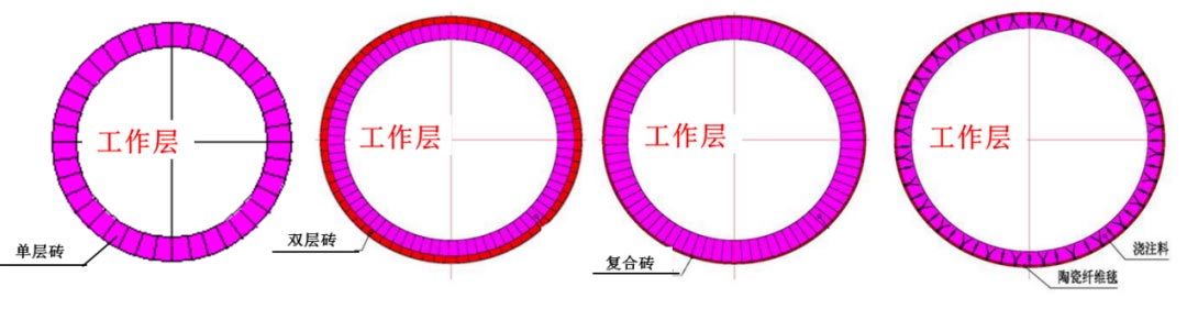 回轉(zhuǎn)窯焚燒爐最關(guān)鍵設(shè)備即為回轉(zhuǎn)窯本體,因其是一種動(dòng)態(tài)運(yùn)轉(zhuǎn)設(shè)備,對(duì)內(nèi)襯結(jié)構(gòu)設(shè)計(jì)要求較高,首先要確保耐火內(nèi)襯在動(dòng)態(tài)高溫狀態(tài)運(yùn)行下整體內(nèi)襯的穩(wěn)定性,防止耐火磚掉磚、抽簽等問(wèn)題。對(duì)于危廢回轉(zhuǎn)窯系統(tǒng)而言,由于轉(zhuǎn)速比較慢,一般在1轉(zhuǎn)/分以下,可以根據(jù)廠(chǎng)房設(shè)計(jì)和節(jié)能要求選擇單層磚、雙層磚、復(fù)合磚和整體澆注等不同結(jié)構(gòu),如圖3所示。回轉(zhuǎn)窯耐火材料總厚度一般是250-300mm不等,其中工作層耐火磚材質(zhì)一般根據(jù)處理溫度和危廢種類(lèi)不同,可以選擇高鋁質(zhì)、剛玉莫來(lái)石質(zhì)以及鉻鋯剛玉質(zhì)耐火材料等。