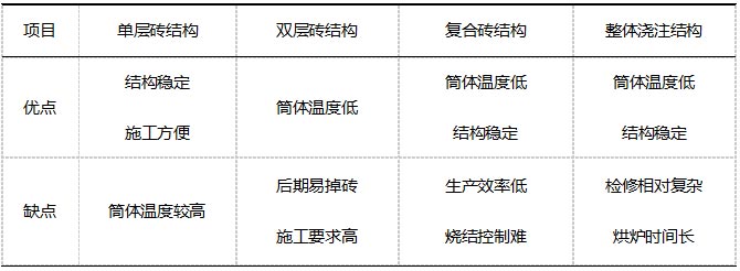 以上幾種設(shè)計(jì)方案優(yōu)缺點(diǎn)如表1所示。相比較而言,耐火磚方案檢修和更換方便,受環(huán)境和人為因素影響較小。現(xiàn)在新建項(xiàng)目回轉(zhuǎn)窯基本都是室外設(shè)計(jì),隨著提產(chǎn)和環(huán)保要求,采用單層結(jié)構(gòu)穩(wěn)定性較好,高溫區(qū)可以考慮凹槽復(fù)合磚方式,降低外壁溫度。而且從防腐蝕角度,筒體外壁溫度控制在160-320℃區(qū)間,比較合理。