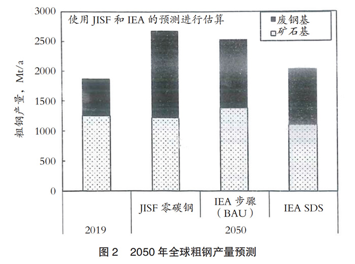 圖3是在各機構(gòu)預(yù)測的基礎(chǔ)上,預(yù)測2050年粗鋼產(chǎn)量。未來,隨著經(jīng)濟的發(fā)展,預(yù)計全球粗鋼產(chǎn)量將繼續(xù)增加。其中,隨著廢鋼產(chǎn)量的增加,雖然來自廢鋼的粗鋼產(chǎn)量也會增加,但為了彌補粗鋼產(chǎn)量的整體增加,來自鐵礦石的粗鋼產(chǎn)量將保持現(xiàn)狀水平。因此,除了盡可能地利用廢鋼,如何減少來自鐵礦石的鋼鐵生產(chǎn)中的CO2排放也是一個主要問題。