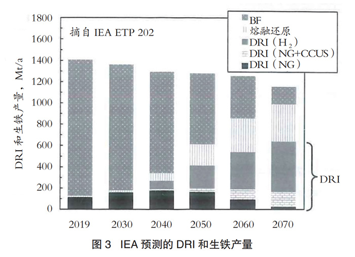 圖4顯示了IEA對不同生產(chǎn)方式的還原鐵和生鐵產(chǎn)量的預(yù)測。假設(shè)鋼鐵行業(yè)根據(jù)上述IEASDS,降低CO2排放量。預(yù)計2050年高爐生鐵產(chǎn)量將逐步下降,而還原鐵產(chǎn)量將從2019年的1億噸增加到2050年的4億噸。這表明,CO2可以通過直接還原天然氣來立即減排,氫氣和CCS也可以達到減排的目的。