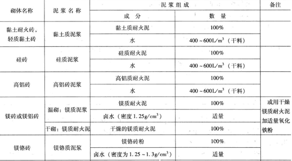 在砌筑高鋁磚時,應用高鋁質耐火泥。砌筑含Al2O360%~70%的高鋁磚時,采用的耐火泥由75%~85%的燒礬土和10%~20%的生粘土組成;砌筑含A12O348%~55%的高鋁磚時,也可采用高耐火度的粘土質耐火泥。