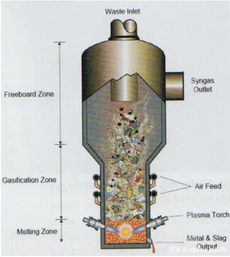 相比傳統(tǒng)燃燒技術(shù),等離子體技術(shù)通過(guò)對(duì)空氣進(jìn)行電離,在千分之一秒內(nèi)溫度可達(dá)3000℃~10000℃,有毒物質(zhì)在高溫下快速裂解,因而不會(huì)產(chǎn)生二噁英,危險(xiǎn)氣體和重金屬在等離子爐中處理后能實(shí)現(xiàn)無(wú)害化。當(dāng)垃圾投入到等離子體氣化爐中后(如圖1),有機(jī)垃圾在爐中,迅速脫水、熱解、裂解,產(chǎn)生以H2、CO和部分有機(jī)氣體等為主要成份的混合可燃性氣體,再經(jīng)過(guò)二次燃燒達(dá)到減容化、無(wú)害化。無(wú)機(jī)物(金屬、玻璃等)在等離子體高溫作用下熔融,達(dá)到了減容目的。等離子體技術(shù)與傳統(tǒng)燃燒技術(shù)相比,對(duì)危險(xiǎn)廢物處理得更加,產(chǎn)生的尾渣呈結(jié)晶態(tài),其組成為無(wú)危險(xiǎn)物,可用于建筑材料,無(wú)需填埋。經(jīng)過(guò)處理,垃圾質(zhì)量大量減少、有毒物質(zhì)裂解、焚燒灰形成玻璃渣,并且轉(zhuǎn)變?yōu)闊o(wú)害的材料,等離子技術(shù)處理高危廢物是危險(xiǎn)廢物處理的發(fā)展趨勢(shì)。
