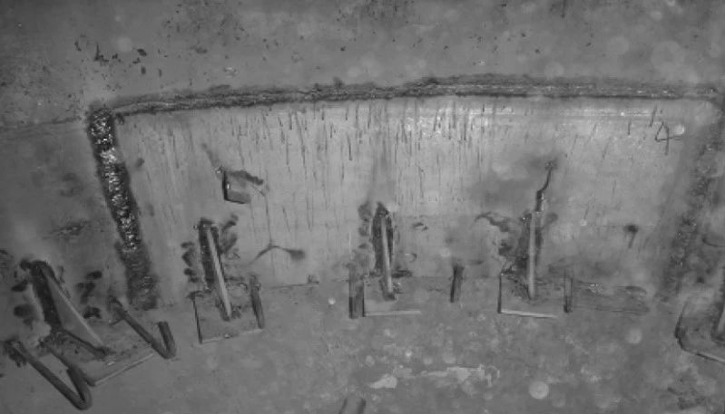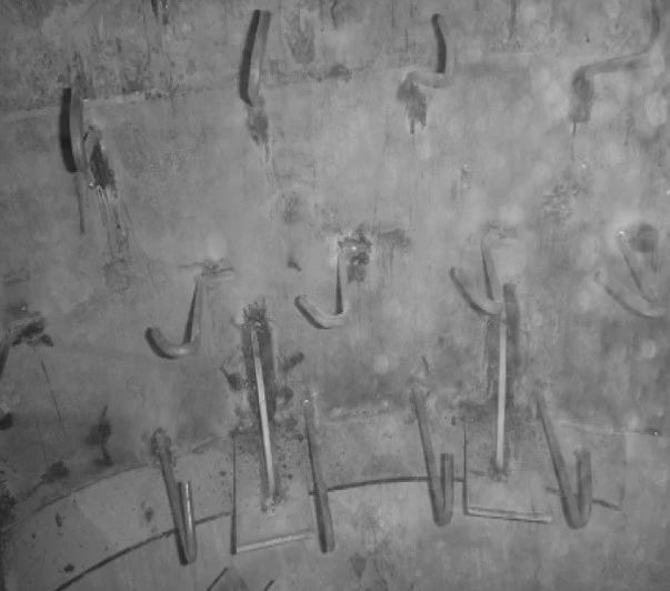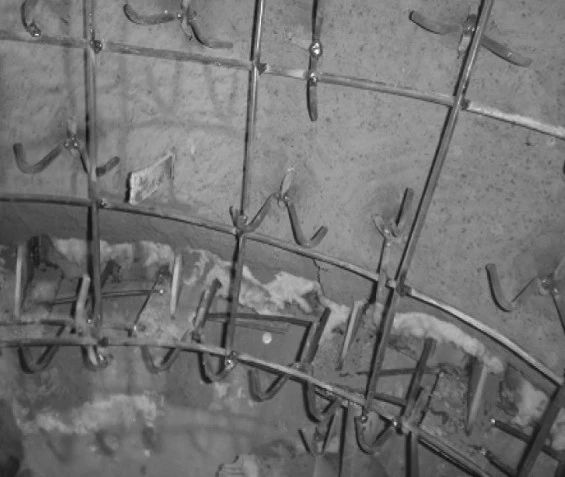 (4)原錨固件為Y銷釘,每隔150mm交錯布置,銷釘端部沒有鋼筋網格,使耐火材料無法形成整體,個別銷釘失效后會使局部耐火材料松動,相鄰耐火材料之間沒有可靠聯系,zui終脫落。