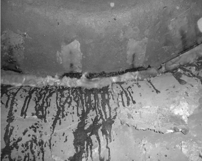 3、耐磨可塑料施工。可塑料敷設在施工構件上后,用木錘或橡皮錘搗打密實。塊與塊之間的接縫也應搗打密實,使接縫嚴密,將表面壓光、壓平。所施工部位與原來墻體接縫處應確保平滑過渡,不得凹進或凸出。用磷酸鋁溶液浸泡硅酸鋁纖維板封堵膨脹縫,避免鍋爐運行過程中出現竄風現象,導致非金屬補償器燒損。耐磨可塑料施工完畢后的膨脹縫封堵如圖4所示。